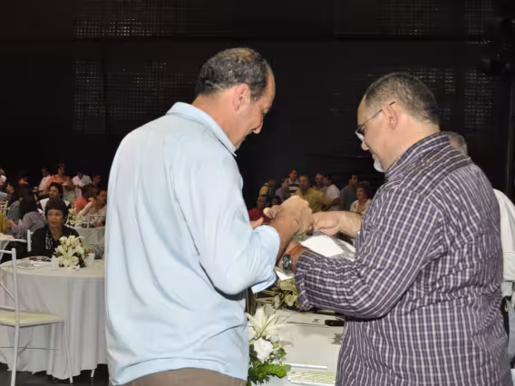 Funcionário recebe os cumprimentos do Reitor Padre Josafá S.J. durante a homenagem.