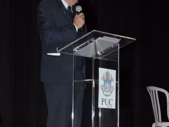 O Reitor Pe. Josafá S.J. parabeniza o aluno pela participação no XX Seminário de Iniciação Científica da PUC-Rio.
