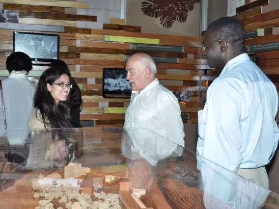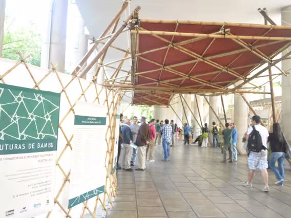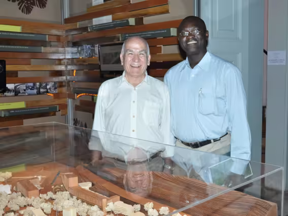 Alunos do prof. Ghavami, do Departamento de Engenharia Civil, em laboratório do ITUC, com maquete/projeto de ponte.