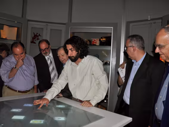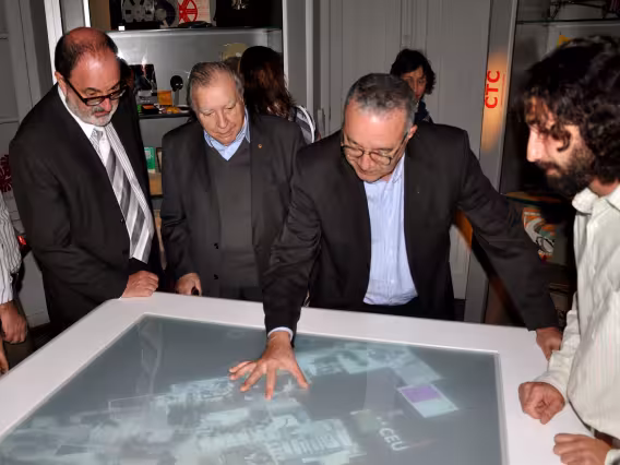 Sala Ícones, mesa interativa com fotos relativas aos quatro centros que compõem a PUC-Rio. Abertura da Exposição PUC-Rio 70 anos, Rumo aos 80.