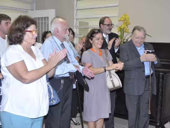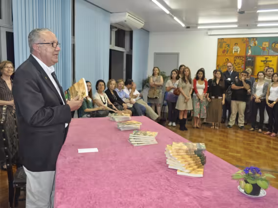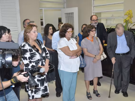 Confraternização após a cerimônia de inauguração da sede do curso de Ciências Biológicas da PUC-Rio. Ao fundo estantes da exposição ´Da natureza às ciências da vida´.