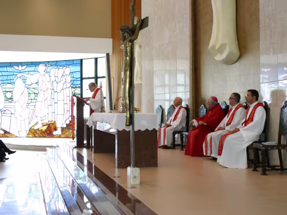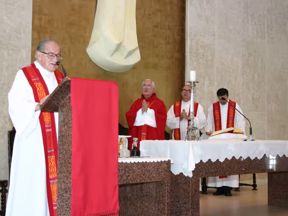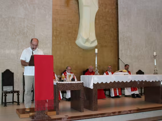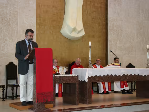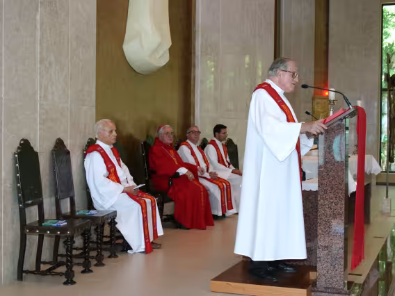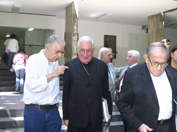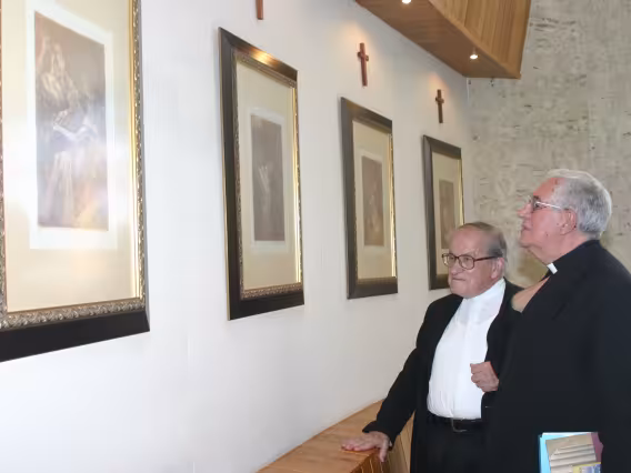 Pe. Jesús Hortal S.J. apresenta a Dom Geraldo Lyrio Rocha a coleção de gravuras representando a Via Sacra, obra do artista Carlos Oswald doada pela família.