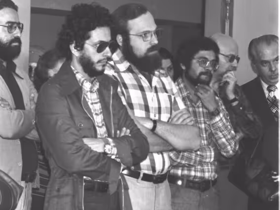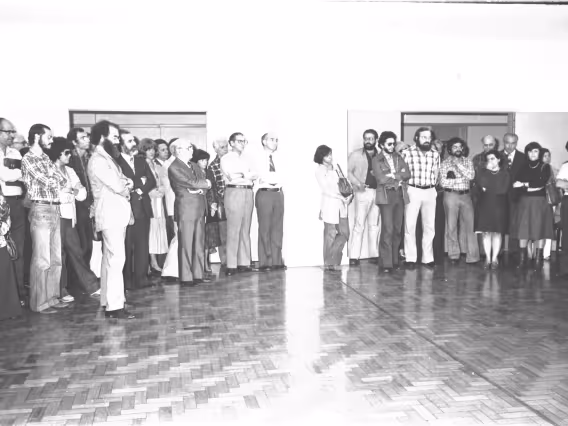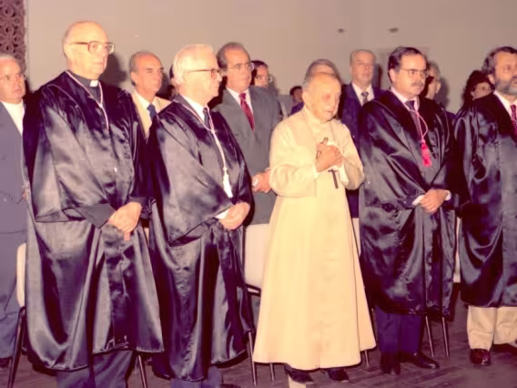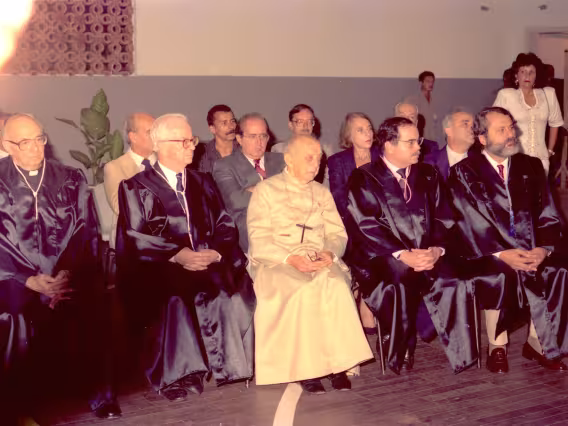 O professor do Departamento de História, Américo Jacobina Lacombe, profere a Aula Inaugural do ano letivo de 1976 intitulada As origens da Universidade Católica.