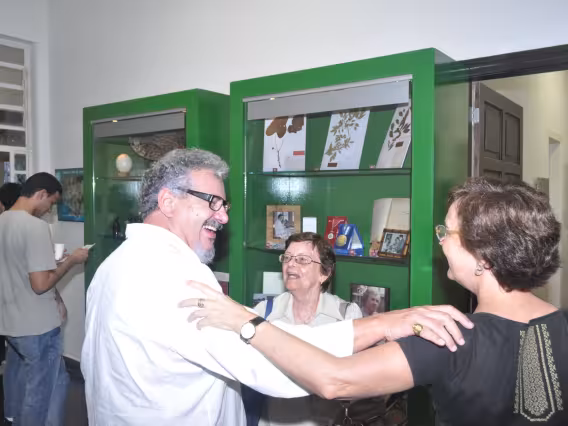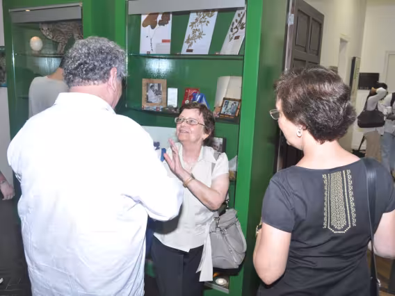 Confraternização após a cerimônia de inauguração da sede do curso de Ciências Biológicas da PUC-Rio. Ao fundo estantes da exposição ´Da natureza às ciências da vida´.
