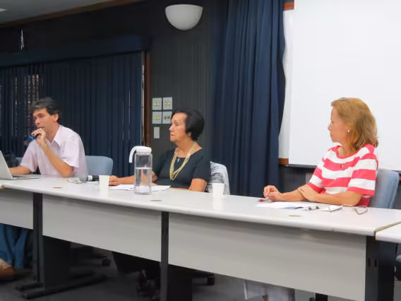 Composição da mesa "A sociedade de consumo e a sustentabilidade: contradição a ser enfrentada pela educação ambiental e em saúde".