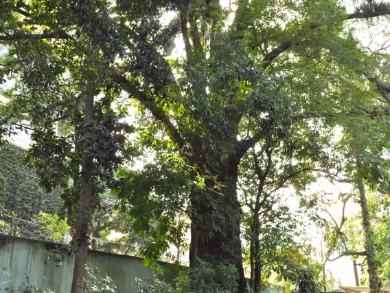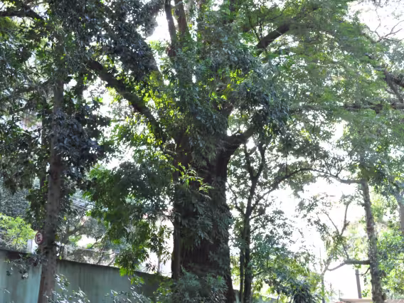 Mulher posa diante do jequitibá localizado no terreno do IOPUC.