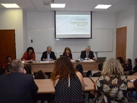 A professora do Instituto de Relações Internacionais Prof. Paula Sandrin; o Prof. Leslie Bethell do CEBRI; a Prof. Monica Herz do Instituto de Relações Internacionais e na ponta o membro do Ceann Comhairle (Speaker) da Lower House do Parlamento Irlandês, Seán Ó Fearghaíl na mesa-redonda “Approaching Brexit: protecting a peace process and preparing for the day after”. O evento foi promovido pelo Instituto de Relações Internacionais da PUC e a Unidade do Sul Global para Mediação (GSUM), em parceria com CEBRI - Centro Brasileiro de Relações Internacionais e a Embaixada da Irlanda no Brasil.