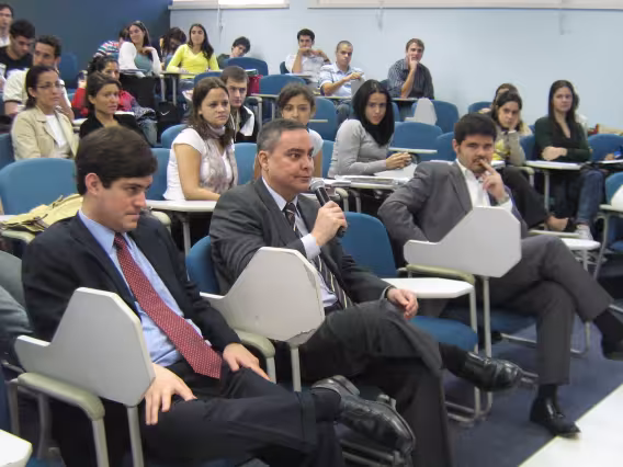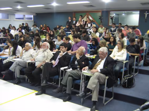 Os demais palestrantes observam a fala da professora convidada Sarah Hayes.