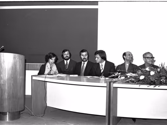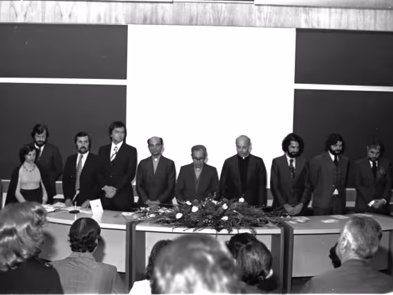 Mesa com autoridades na cerimônia de formatura do curso de Processamento de Dados, primeira turma do antigo P-15.