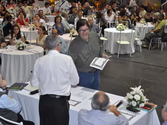 O professor Raul Rosas recebe os cumprimentos do Padre Josafá S.J. pelos 35 anos de dedicação à PUC-Rio.