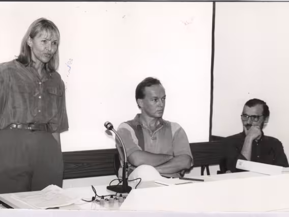 Profa. Heidrun Olinto e prof. Karl Erik na conferência "Pós- moderno, um prefixo irritante".