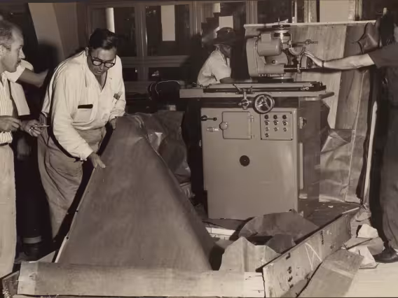 Chegada de equipamentos trazidos em caminhão para os laboratórios do ITUC. Trabalho fiscalizado pelo Irmão Francisco. Fotografia do Acervo Comunicar.