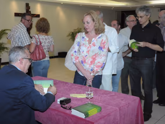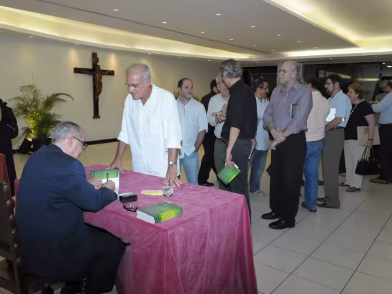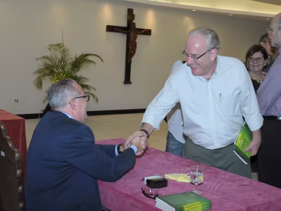 Convidado cumprimenta o Reitor Pe. Josafá S.J. na mesa de autógrafo