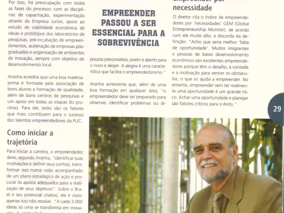 Matéria da Revista PONTES, n°1, sobre o papel da PUC-Rio na formação de empreendedores na área de inovação tecnológica e pesquisa. PUC-Rio, 'A casa de talentos em tecnologia'. (página 29)