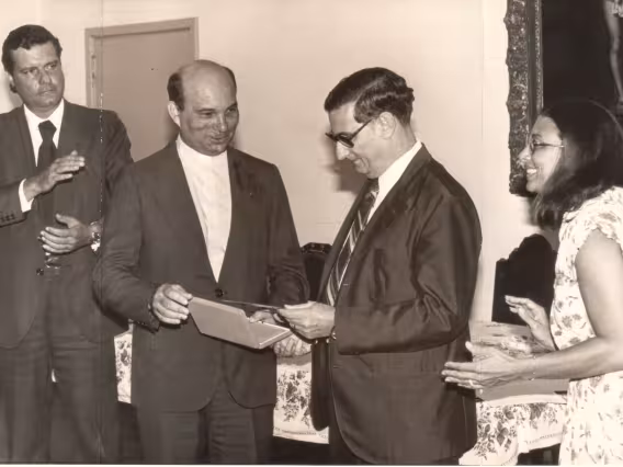 O Vice-Reitor de Desenvolvimento cumprimentando Deotília Ormonde do Carmo, eleita funcionária-padrão da Universidade.