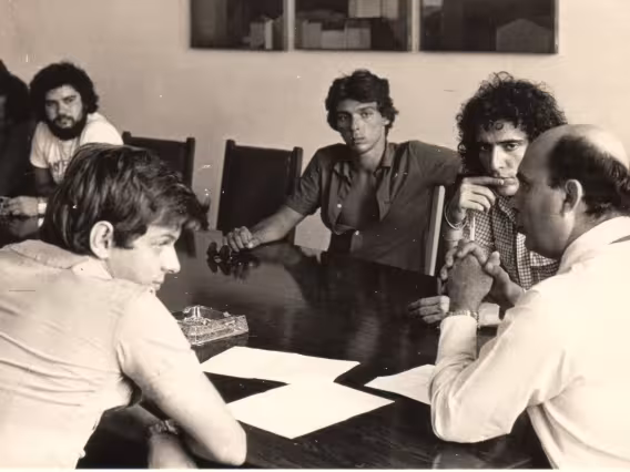 Código exclusivo cg0036_070 Coleção Acervo do prof. Paulo Novaes - Vice-reitoria de Desenvolvimento - parte 2 Data de criação 01/03/1980 Natureza do documento imagem Tipo de documento fotografia PB Descrição Reunião do Reitor com o DCE.