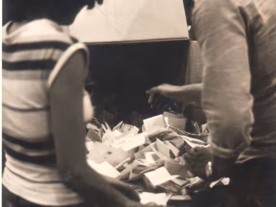 Código exclusivo jf0015_045 Coleção Apuração de votos para a UNE Data de criação 05/10/1979 Natureza do documento imagem Tipo de documento fotografia PB Descrição Mesa de apuração dos votos.