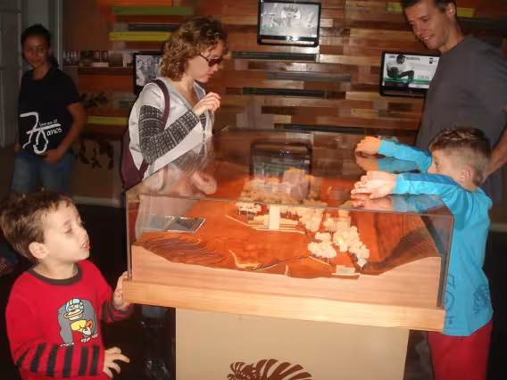 Visita de professores do Norte e Nordeste formados em História no curso de Educação à Distância da PUC-Rio à Exposição PUC-Rio 70 anos. Sala No Tempo, com a maquete do campus Gávea.