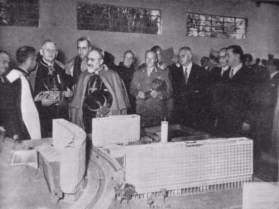 Inauguração da nova sede da PUC-Rio na Gávea. O reitor pe. Pedro Belisário Velloso Rebello S.J. e as autoridades presentes apreciam a maquete do novo campus em exibição no ginásio esportivo.