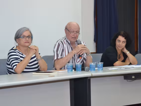 O prof. Sílvio Tendler acompanha a palestra 30 anos da Nova República.