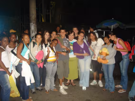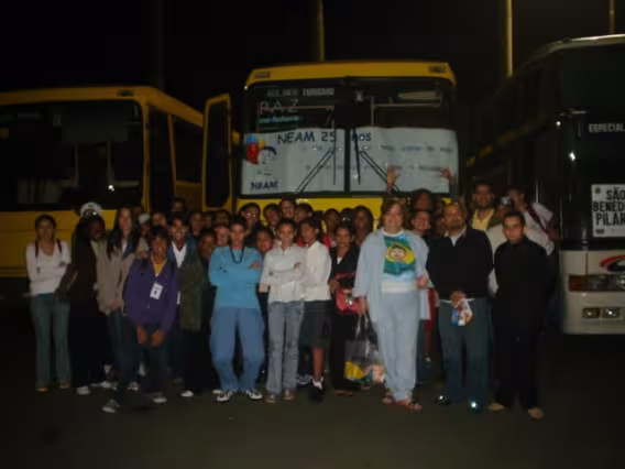 Professora Marina Moreira com alunos da 1ª Comunhão em passeio à Bienal do Livro. Uniformes de escola pública municipal. Em frente à casa XV, do CCE.