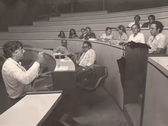 O Grão-Chanceler da PUC-Rio, cardeal dom Eugênio de Araújo Sales, e o reitor pe. João Augusto Anchieta Amazonas Mac Dowell S.J. participam da mesa de abertura do Seminário Interno do Centro de Ciências Sociais. O evento, coordenado pela Vice-reitoria de Desenvolvimento, debateu a função da pesquisa, as fontes de financiamento, a relação ensino-pesquisa e promoveu a troca de informações e a integração entre os diretores e os professores dos departamentos constitutivos do CCS para a elaboração de um Plano Diretor da PUC-Rio. O seminário foi realizado entre os dias 05 e 06 de setembro de 1979 no Centro de Estudos e Formação do Sumaré.