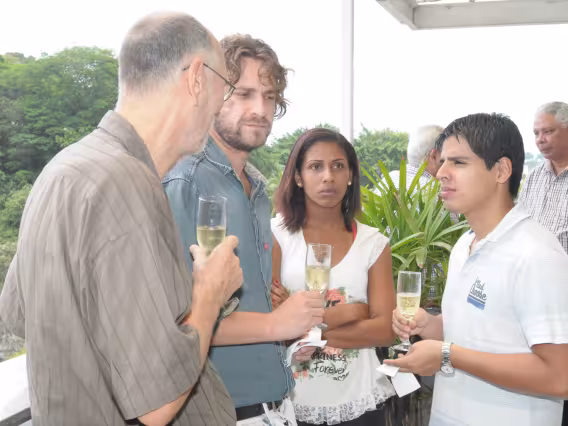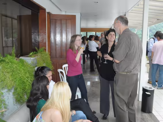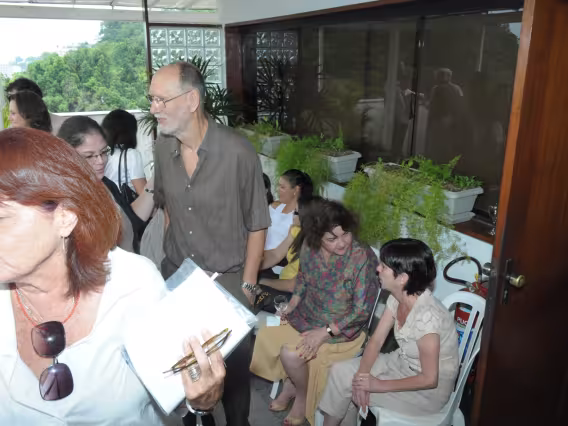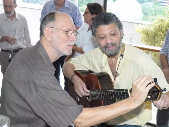 Prof. Miekeley afinando violão enquanto funcionário toca durante confraternização no Decanato do CTC.