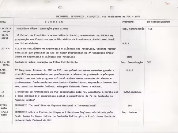 O Relatório apresenta o balanço das atividades acadêmicas da PUC-Rio do ano de 1978. A publicação contém informações do corpo docente e discente, da Associação dos Docentes (ADPUC) e da Associação de Funcionários (AFPUC), do projeto de reformulação da Regulamentação da Carreira Docente e dos convênios estabelecidos com a FUNARTE, FINEP, BNDE, MEC, IPHAN, entre outros. Destaca os projetos, os eventos, as palestras e os seminários realizados em 1978 e traz também dados sobre a situação financeira da Universidade e das bolsas de estudos. O Relatório foi apresentado pelo reitor pe. João Mac Dowell S.J. na abertura do ano acadêmico em 09 de março de 1979.