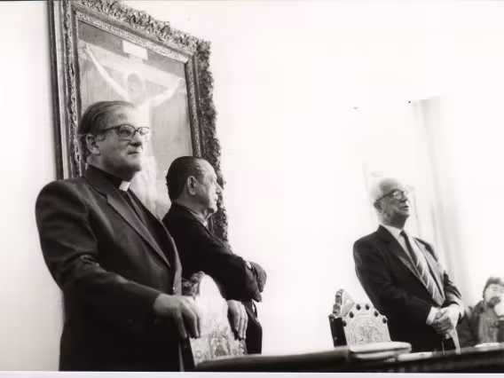 O pe. Jesús Hortal Sànchez S.J. ao lado do reitor pe. Laércio Dias de Moura S.J. em evento na sala do Conselho Universitário.