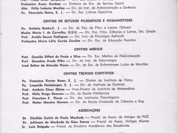 Página 10 do Catálogo Escolar do Centro Técnico Científico. Lista de Diretores de Entidades Universitárias: Centro de Estudos Jurídicos e Sociais; Centro de Estudos Filosóficos e Humanísticos; Centro Médico; Centro Técnico Científico; Centro de Intercâmbio e Promoções; além dos diretores das Associações e da Tesouraria.