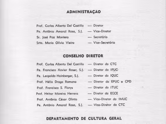 Página 15 do Catálogo Escolar do Centro Técnico Científico. Lista de membros da Administração, do Conselho Diretor e do Departamento de Cultura Geral do CTC.