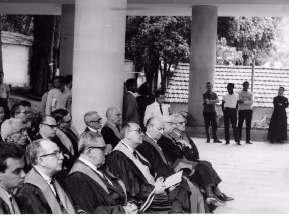 Plateia presente na comemoração do Jubileu de Prata da PUC-Rio. Na ocasião, com a presença do Embaixador da Alemanha Ocidental, foi inaugurado o prédio da Biblioteca Central, ainda em obras, e houve a entrega das medalhas Cardeal Leme aos professores e o descerramento das placas aos benfeitores.