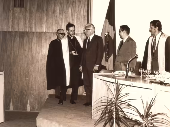Grupo de pessoas na secretaria do Departamento de Física. Aviso "Seja breve" em cima da mesa.