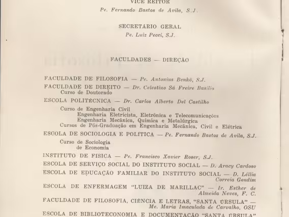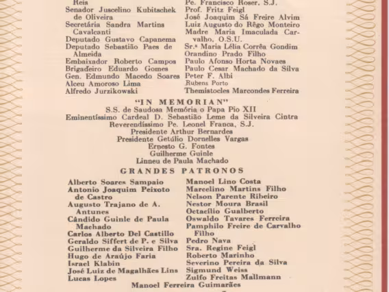 Carta ou circular em papel timbrado da Campanha Financeira de 1963, com um texto assinado pelo Reitor Pe, Laércio S.J. endereçado a "Prezada antiga aluna da P.U.C." em que pede apoio à campanha financeira. Nas margens do papel há os nomes de todos os organizadores da Campanha, do Conselho de Curadores, dos Grandes Patronos, da Comissão de Honra da Universidade (composta pelo Presidente João Goulart, pelo Governador Carlos Lacerda, por Dom Armando Lombardi, e por cardeais, deputados, senadores e pessoas ligadas diretamente à PUC-RIo), dos responsáveis pela Divulgação, pelas Promomoções Sociais e a Comissão de Planejamento.