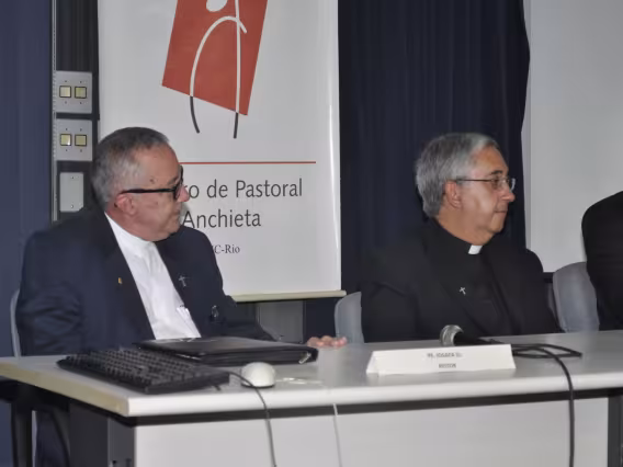 Os padres Josafá Siqueira S.J. e Alfredo Sampaio Costa compõem mesa durante evento.