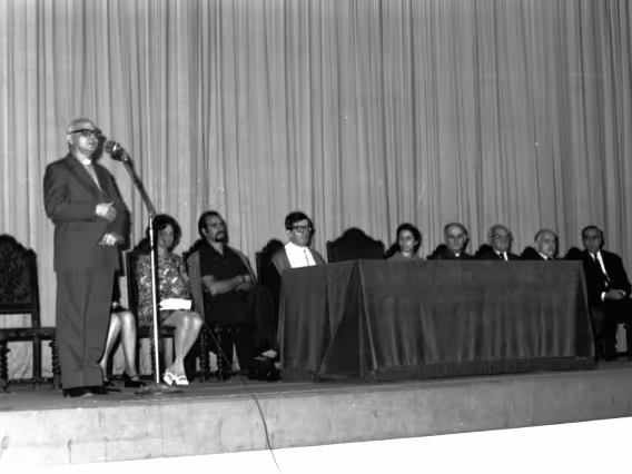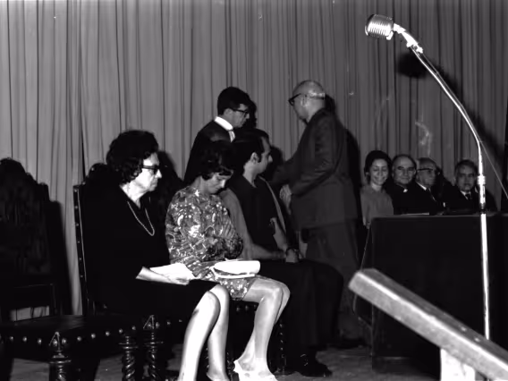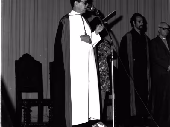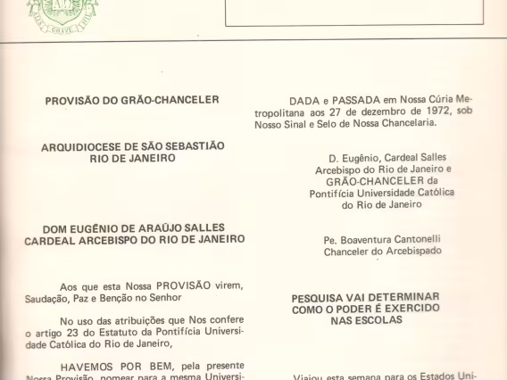 Capa do número 56 de 05/01/1973 do Boletim PUC-Rio com o brasão da Universidade. O Grão-Chanceler Dom Eugênio Salles nomeia o pe. Paulo de Tarso Nacca S.J. como Vice-reitor Administrativo e o pe. Antonius Benko S.J. como Vice-reitor Acadêmico. Matéria "Pesquisa vai determinar como o poder é exercido nas escolas".