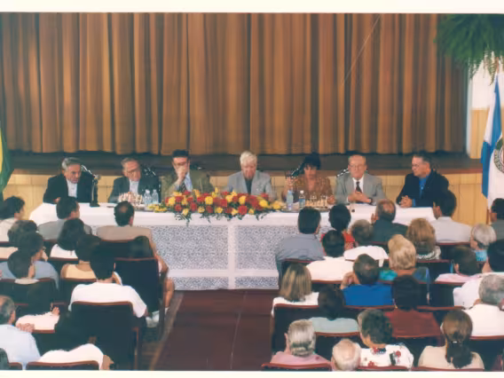 Código exclusivo ak0006_029 Coleção Acervo do Pe. Jesús Hortal Sànchez S.J. Data de criação 01/01/2005 Natureza do documento imagem Tipo de documento fotografia cor Descrição Mesa com autoridades em auditório.