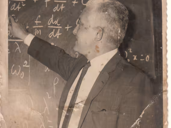 Código exclusivo cg0072_015 Coleção Fotos do Acervo do Departamento de Física Data de criação 01/01/1965 Natureza do documento imagem Tipo de documento fotografia PB Descrição Professor Lucie ministrando aula em frente a um quadro-negro.