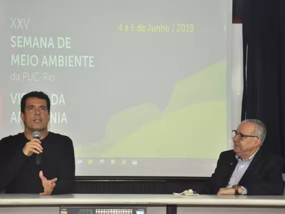 O professor André Trigueiro, do Departamento de Comunicação Social e o reitor da Universidade Padre Josafá Siqueira S.J. na palestra sobre o panorama ambiental no Brasil.