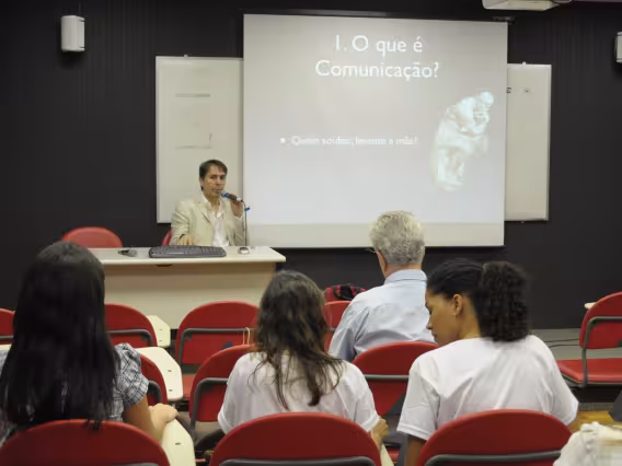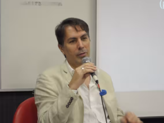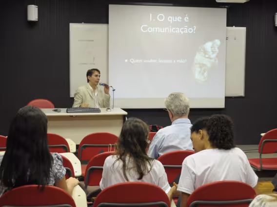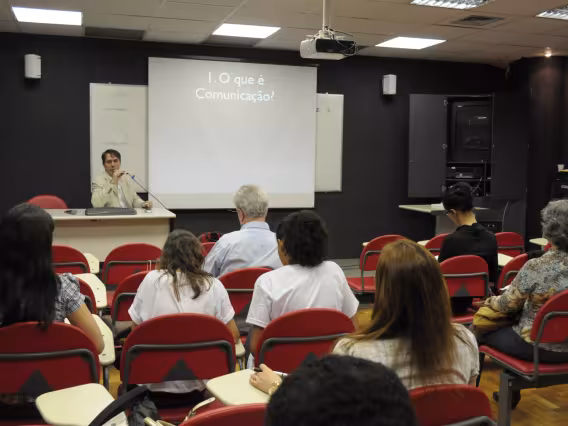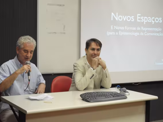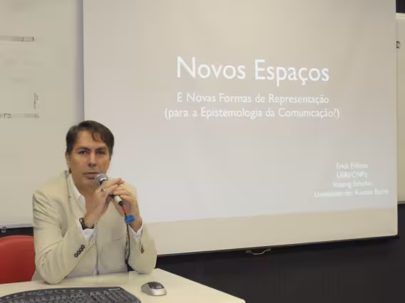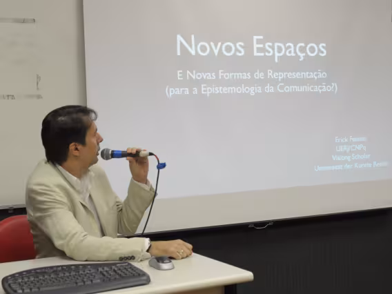 O Professor Erick Felinto, da UERJ, oferece a palestra 'Novos Espaços e Novas Formas de Representação (para a Epistemologia da Comunicação?)', no Seminário dos Alunos do Programa de Pós-Graduação em Comunicação Social da PUC-Rio (POSCOM VIII). A imagem registra o tema 'I. O que é comunicação? Quem souber levante a mão'.