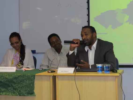 Seminário de Reflexão e Memória da Cultura Afrobrasileira', realizado na PUC-Rio em novembro de 2011. A imagem registra a mesa 'Territórios e territorialidades negras', coordenada e mediada pela Professora Ynaê Lopes dos Santos e formada pelos professores Maurício Arruti, do Departamento de Educação, Job Eloísio, do Departemento de Direito, e Adrelino Campos.