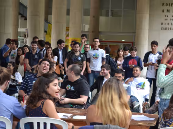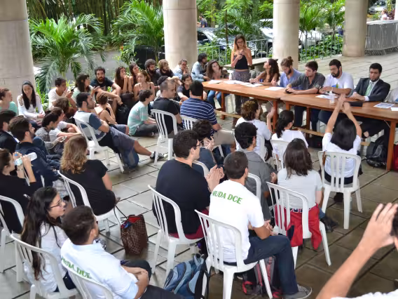 Funcionários da Associação de Alunos da PUC posam com faixa de protesto.