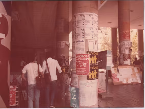Cartazes e faixas do movimento estudantil em campanha para o DCE. Chapas Unidade e Travessia.