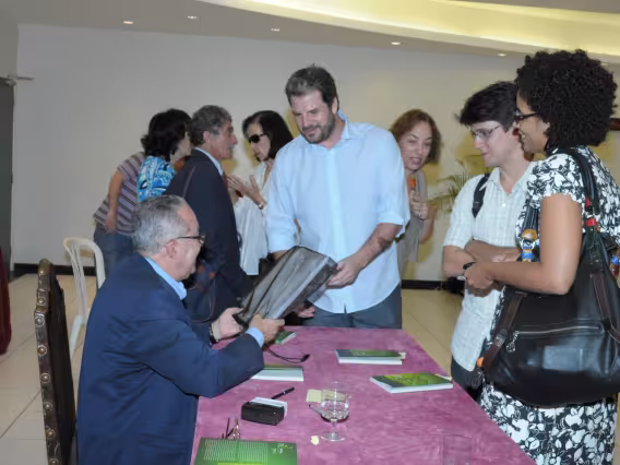 Convidados em volta da mesa de autógrafos do Reitor Pe. Josafá S.J.