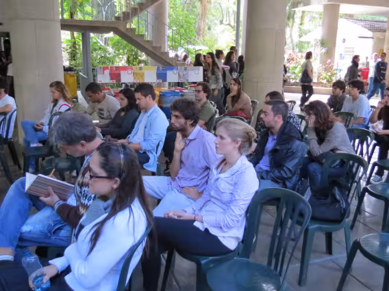 Plateia assiste a debate sobre segurança pública. Vista do alto da escada.