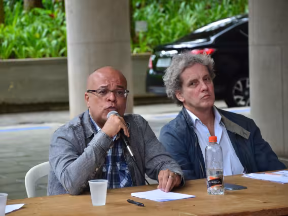 O professor Antonio Alkimin e o professor Marcelo Burgos, do Departamento de Ciências Sociais, na mesa contra o contingenciamento econômico feito por quatro meses nas faculdades.
