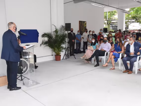 Painel instalado na parede externa do Edifício Cardeal Leme - Bloco B, com a frase 80 anos de Ciências.