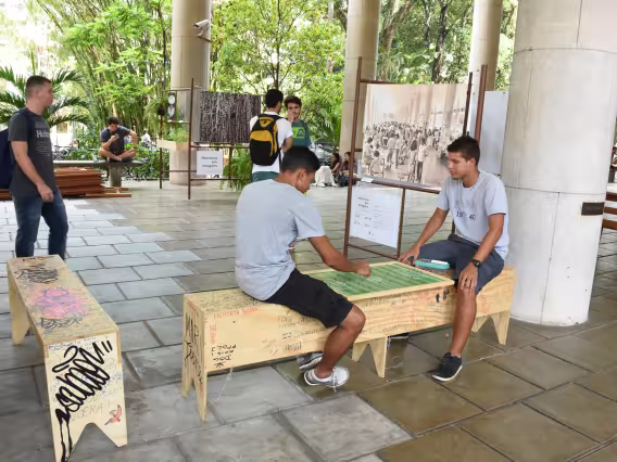 Bancos para as pessoas deixarem mensagens escritas e para jogo de Dedobol.