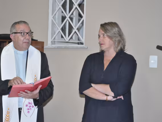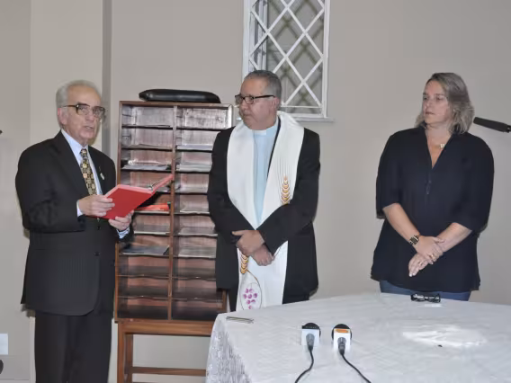 O pe. Pedro Guimarães Ferreira, S.J., o reitor Pe. Josafá, S.J. e a coordenadora do curso de Ciências Biológicas profa. Rejan Guedes-Bruni durante a cerimônia.