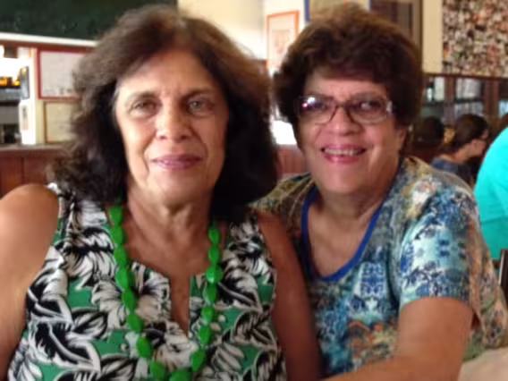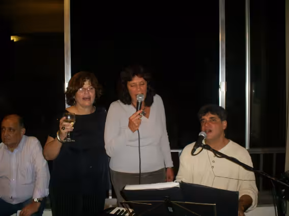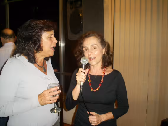 Reunião na casa da profa. Vera Candau (EDU) pelo aniversário da profa. Ana Waleska (EDU), que aparece ao lado da profa. Isabel Alice Oswald (EDU).